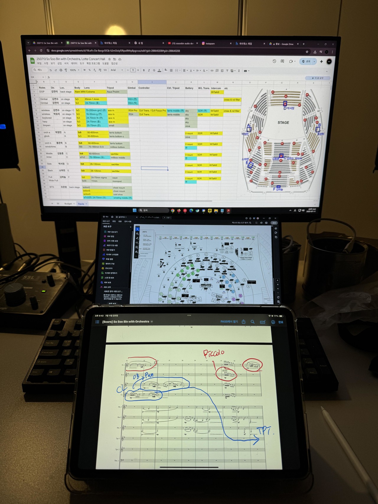 음악이 진행됨에 따라 해당 악기가 나오는 장면을 정확하게 잡기 위해서 사전에 음악을 숙지하는 과정을 거치는데, 이때 악보 분석 및 촬영 계획을 수립합니다.